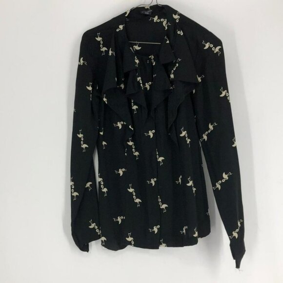 Club Monaco black flamingo print ruffle neck blouse small