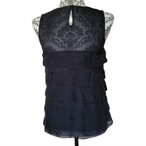 Black silk tank top, sheer at the top with layered ruffles, single button in back with keyhole opening. Size tag has been cutoff, listed as a small based on measurements and fit on mannequin. Please see measurements in pics. In very good used condition