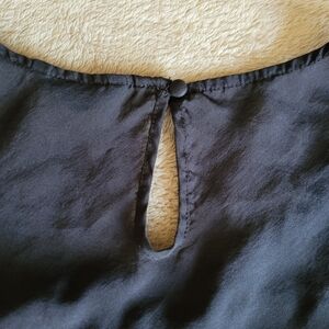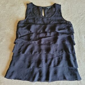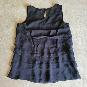 Black silk tank top, sheer at the top with layered ruffles, single button in back with keyhole opening. Size tag has been cutoff, listed as a small based on measurements and fit on mannequin. Please see measurements in pics. In very good used condition