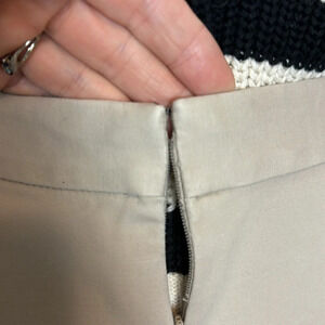 Invisible zipper, hook and eye closure. Fibre tag is missing but it’s been cared for as a stretch cotton fabric.