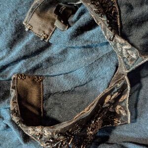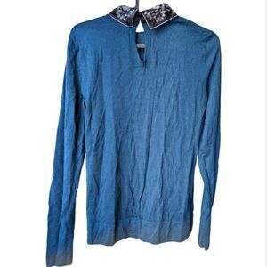 lightweight merino wool sweater. For effortlessly adding sparkle and shine, all season long. Merino wool Straight fit 25" in length, based on a size M Sheer embroidered point collar with sequin details; keyhole at back with double hook-and-eye closure Dry clean Imported | Club Monaco