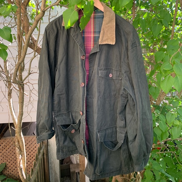 Club Room green button up fall jacket. Great condition- no flaws. Plaid interior. Long.