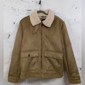 Club Room faux suede jacket in tan with a soft sherpa fleece lining. Features a zip-up front closure, two large front flap pockets with button and slit openings, and a sherpa-lined collar with a decorative strap. Outer material is smooth and suede-like to the touch. The interior is fully lined for added warmth. Ribbed detailing at the hem and cuffs. Tag reads “Club Room.”