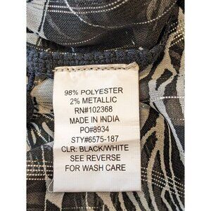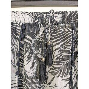 The Club Z Collection Wide Leg Pull On Beach Pant Sheer Cover Up in size XL is a stylish and lightweight cover up perfect for beach days. Made from polyester and metallic fabric, these pants feature a botanical pattern in black and white with pom pom trim and tasseled accents. The elastic waist ensures a comfortable and adjustable fit, while the sheer design adds a touch of elegance to your beach look. Machine washable and designed for regular sizing, these pants are ideal for women who love nature, beach themes, and bohemian style. Flyaway splits on both legs in front.