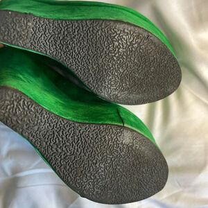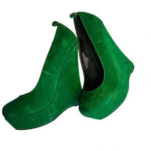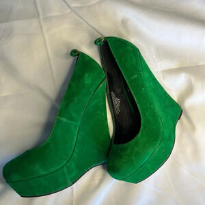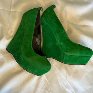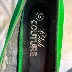 Step out in style with these vibrant green suede wedge heels. Perfect for adding a pop of color to any outfit. Club Couture Emerald Green Suede-like Novelty Heels. Gently worn but only indoors. Elevated wedge for more comfort. Slightly worn in front and in a few places. Size 6