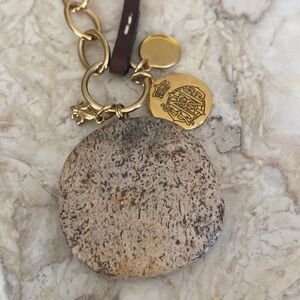 Cool Club Monaco mixed media necklace, leather and gold tone large open link chain featuring a smoothly polished stone and three dangle charms, one is a Fleur de Lys , another is a simple plain circle and the third is Harrods Knightsbridge button featuring North, South, East and West.