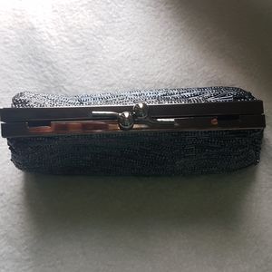 Beautiful, grey-beaded clutch that offers a bit of sparkle and elegance. In like-new condition inside and out. Comes with chain.