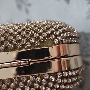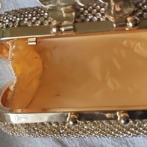 Super cute peacock gold and crystal clutch..one Stone listing on peacock had to use a light to see it..and on bottom see photos.Stunning clutch for evening affair..missing stone will not be noticed.a few spots on lining..but very very clean