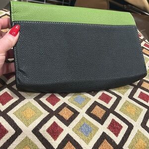 Blue and green clutch with gold hardware. No shoulder strap in good use condition. Some marks on the inside has seen in photos.
