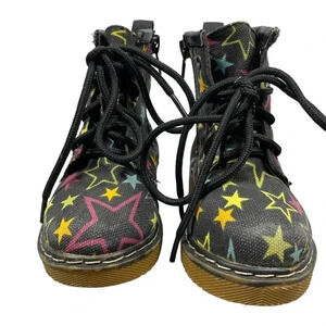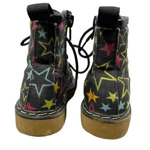 Jumbo CoCo combat boots. They are black with multicoloured blue, yellow, orange and pink stars. Has a back zipper and front laces. Has back pull tabs. In great condition.