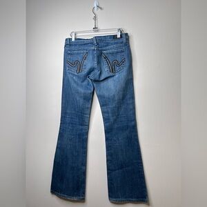 Style: This Wimbledon Ingrid flare jean has a soft light to medium wash with slight distressing on the pockets, whiskering and the signature Citizens of Humanity stitching design on the back pockets, but in a wider natural and blue embroidery.