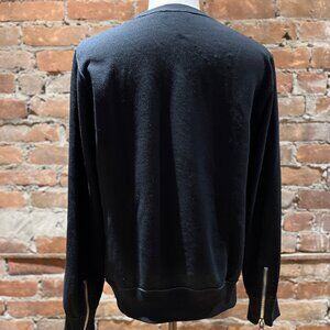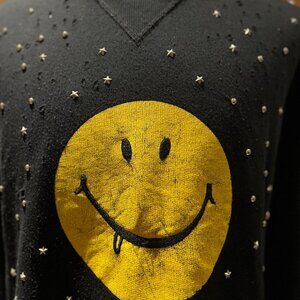 Rare Coach 1941 runway-era graphic sweater featuring a distressed black cotton-blend body, star and dome-stud embellishments, and the brand’s playful grunge-inspired smiley face graphic. Below the large yellow smiley, tonal flocked lettering reads “Have a Groovy Day”, adding a subtle textured finish.