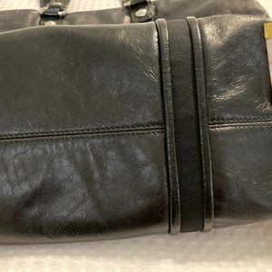 Limited Edition Liquid Glass Top-Zip Tote, manufactured in 2009 with original zipper. Excellent condition 'like-new' exterior trimmed with silver Coach logo rings, featuring 7" drop shoulder straps and matching trim with rolled rim. The bag has gathered sides, extendable by loosening shoelace trim. Also, 16" drop nylon crossbody strap with a dog leash clip, 2 original Coach tags, and 3 exterior front pockets. Poppy interior with 3 multifunction pockets has some ink marks.