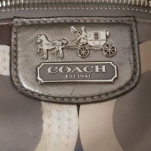 Dark blue, light blue, grey, brown, and cream Cs. Metallic silver straps. Does include longer shoulder strap. Outside has a few markings. All the sequin areas are in great shape! Greyish-blue satin lining. Has two inside side pockets and one zip pocket. Zips shut on top- all zippers are in working condition. Serial No. H1120-19179