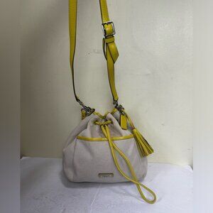 Beautiful bucket with tassel bag in tan canvas and chartreuse leather with silver tone hardware