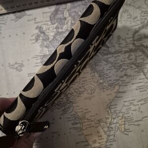Chic Coach wallet with a black and tan pattern. Features a stylish circular clasp. Ideal for everyday use.