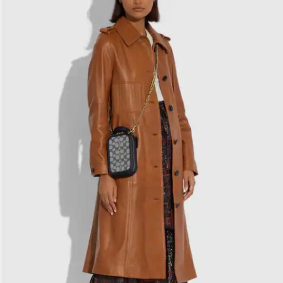 Coach Alie Camera Bag in Signature Jacquard, Navy Midnight Navy with Brass Hardware. Can be worn as a shoulder or crossbody.