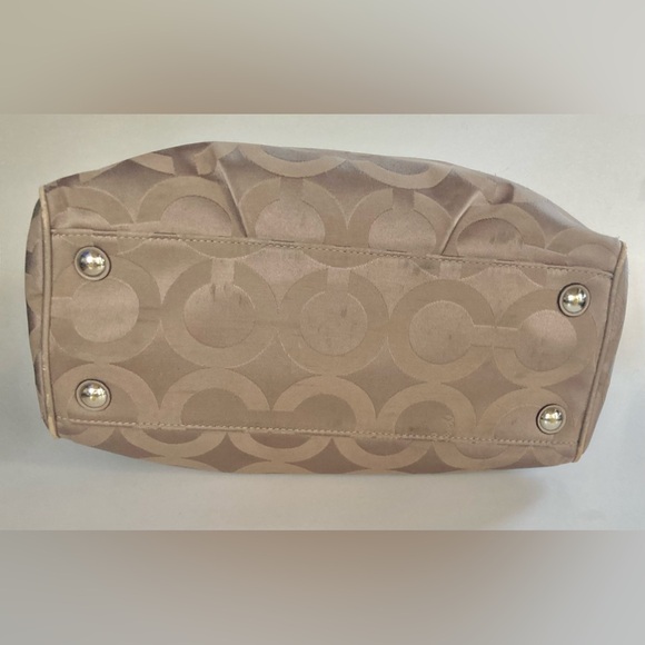 Coach bag in good condition. Some slight wear on bottom corners and on handles but nothing noticeable unless inspecting closely. Clean inside with several pockets on each interior side. A really nice taupe colour that will go with anything. This bag will carry a lot at 12”x9”x5” and is lightweight compared to a full leather bag.