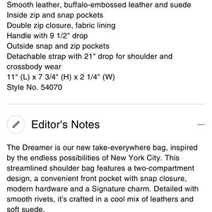 Gorgeous smooth leather with suede. It’s got two compartments but still lays flat which makes it both utilitarian and fabulous. Only used about twice? I love it but don’t reach for it much anymore. It has a small corner stain. I haven’t tried getting it off but I’m sure some suede cleaner will do the trick. Perfect bag for fall!