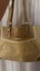 Elegant Coach tote in beige and cream. Features sturdy leather straps. Ideal for daily use.