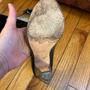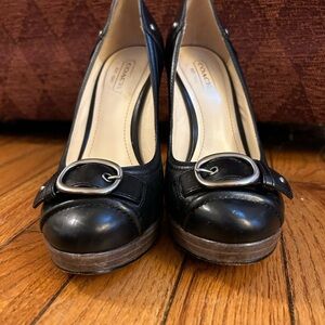 Classic Coach Styling with these black leather stacked heel shoes, buckle detailing.
