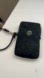 Elegant black wristlet clutch. Features signature Coach pattern. Secure zip closure. Ideal for essentials.