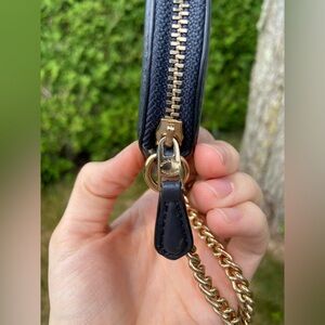 Black coin purse with a vibrant tropical scene. Features a gold chain.