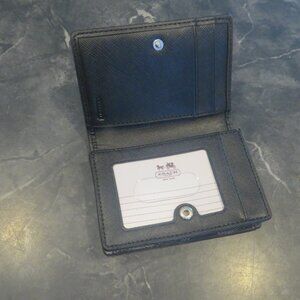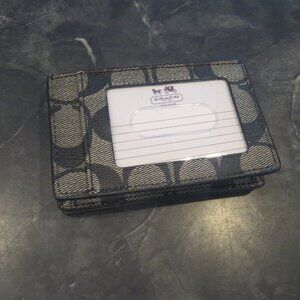 Brand new with tags, authentic Coach compact wallet crafted in black and grey Signature coated canvas with smooth black leather trim. This functional piece features a snap closure with silver-tone Coach logo button, multiple card slots, and a clear ID window for convenience.