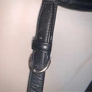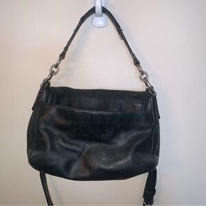 Elegant black leather crossbody with adjustable strap. Features silver hardware and front buckle detail.