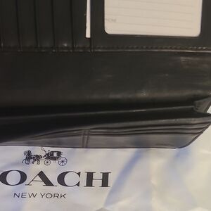 Sleek black leather wallet by Coach. Features elegant design with logo detail. Perfect for everyday use.