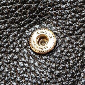 Coach Black Pebbled Leather Fold-Over Wallet, converts to clutch or crossbody. Accommodates phone with 8 card slots, back slip pocket for bills, and a center pocket for phone. Features a zippered area and pleated sides for extra capacity. Gold-tone hardware and a removable, adjustable crossbody strap. Measures 8" x 5". Clean inside, no rips. In overall very good- excellent condition, with some creasing and indent marks on the inside flap. Perfect blend of style and functionality