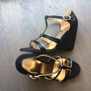 Coach | Black Satin Gold Trim Wedge Heel Sandals