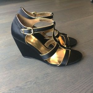 Elegant and glam black and gold wedge heel sandals.