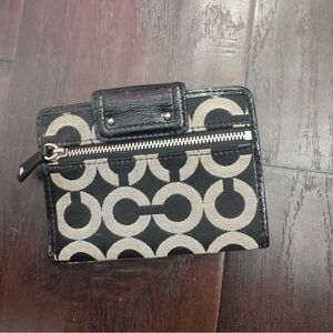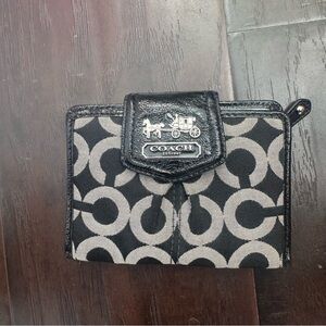 Stylish Coach wallet with iconic pattern. Features a secure snap closure. Compact and elegant design.