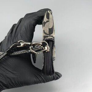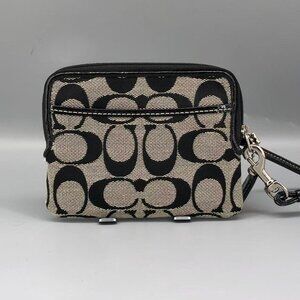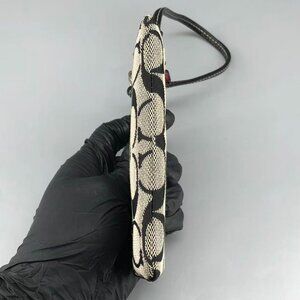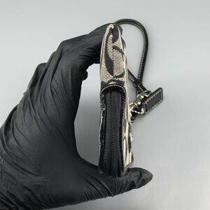 Stylish Coach wallet with iconic black and gray pattern. Compact and chic for everyday use.