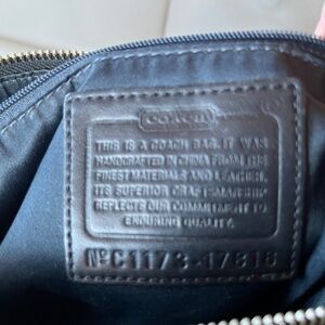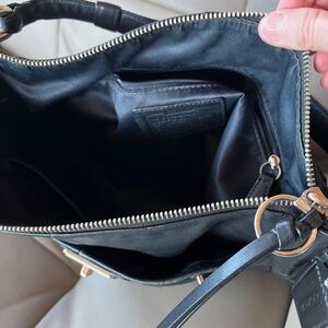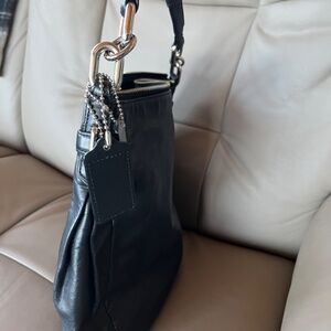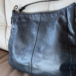 Classic black leather with silver accents. Excellent condition inside and out, clean and well maintained. Size is approximately 11" wide; 10" high.