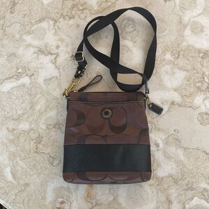 In excellent preowned condition Coach Black and gorgeous aubergine brown Signature Canvas Swingpack adjustable crossbody bag. Except for a few interior pen marks, this bag is almost in as new condition. Gorgeous colour, gold tone hardware, two exterior slip pockets, zippered main compartment, interior has a pink satin lining with one slip pocket. Adjustable strap, brand hang tag, just a fabulous little bag.