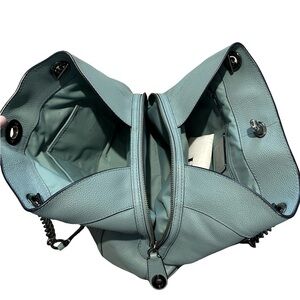 This Coach shoulder bag in a striking blue leather offers a blend of elegance and practicality. Its structured design is complemented by a chain-and-leather strap, making it a versatile choice for everyday use. The bag's minimalist aesthetic and high-quality craftsmanship ensure it remains a timeless accessory. inside is an excellent condition same with the outside comes with dust bag as well. On the safe side. This bag shows a nine out of 10 all sales are final