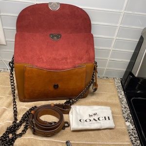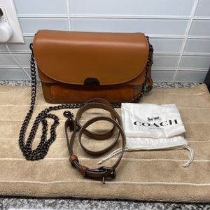 Elegant brown leather with chain strap. Sleek and stylish design.