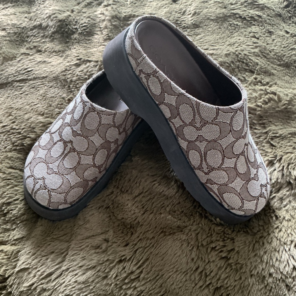 Stylish Coach mules with signature pattern. Comfortable and chic design.