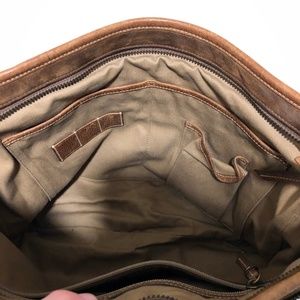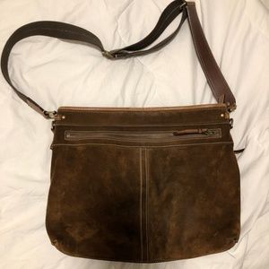 Barely used. From a pet and smoke-free home. Brown suede with leather details. Adjustable mixed leather and canvas shoulder strap. Two medium front pockets, one large back pocket, one large and two small inner pockets, with leather pen holders and mini pouch pocket.