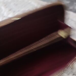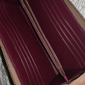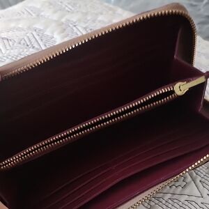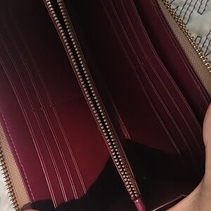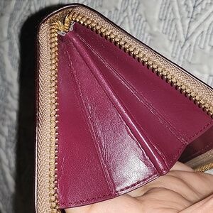 Stylish Coach wallet in brown and pink. Features signature logo design.