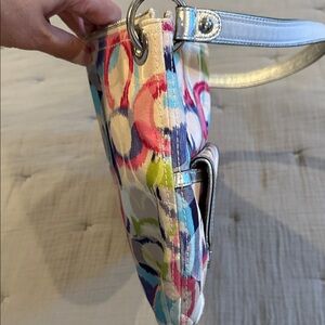 Eye-catching Coach bag with vibrant circle design. Features silver accents and dual front pockets. Ideal for a chic look.