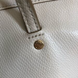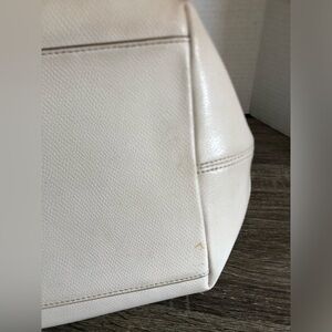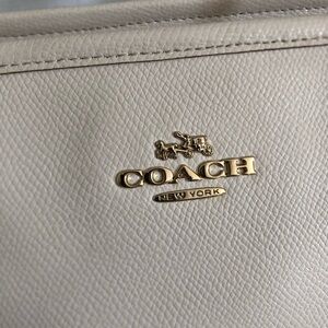 Elevate your style with this classic Coach tote. This elegant bag features a spacious interior, perfect for daily essentials. Crafted with high-quality leather, it offers both durability and sophistication. The cream color adds a touch of elegance to any outfit. One zippered inside pocket, two open inside pockets and a zipper across the top of the bag itself to keep your items secure. Shoulder length strap.