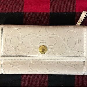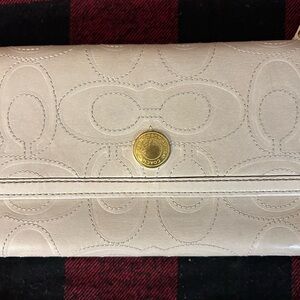 This Coach wallet showcases a sophisticated cream hue, crafted from high-quality leather with an elegant embossed pattern. Its sleek design offers a stylish way to carry your essentials, making it a perfect accessory for any occasion.