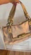 Chic Coach shoulder bag in cream and tan. Features elegant design with sturdy handles.