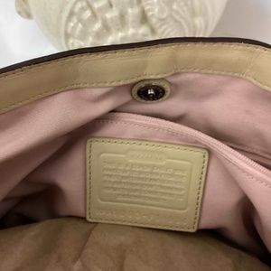 Expertly crafted with a sophisticated combination of pink jacquard canvas and beige leather trim, the Coach Cricket Signature Purse is the perfect blend of style and functionality. Features: Zip top closure with leather pull for center compartment