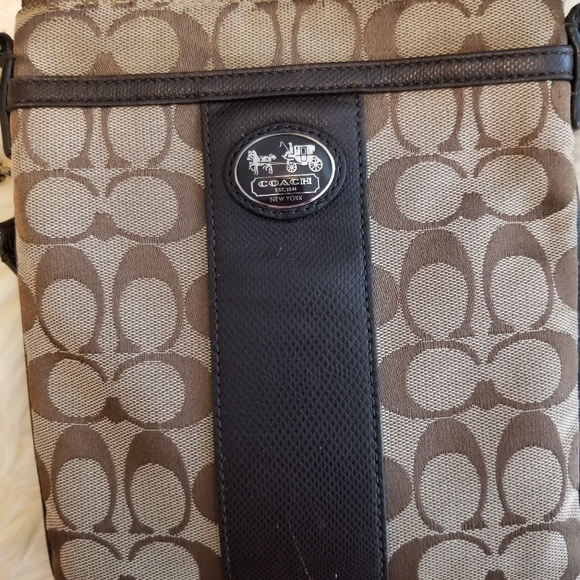 Coach crossbody bag, 7 1/2" x 8 1/2". Brown and tan with cream strap, the purse is clean, however the lining has stains....please check pics.