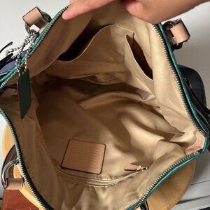 Design: The tote features a combination of navy blue and green leather with natural leather accents on the handles and trim, including a matching Coach hangtag.