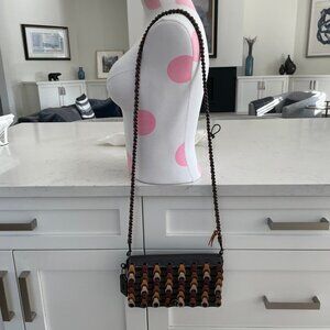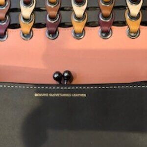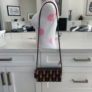 Features: Front of bag has unique metal grommet hardware with 4 different colors of leather: tan, cream, burgundy + med. brown. Strap is metal chain with leather woven through it. Turn lock flap closure, multi functional pocket inside for easy access, sewn-in change pouch with matching dark grey metal hardware